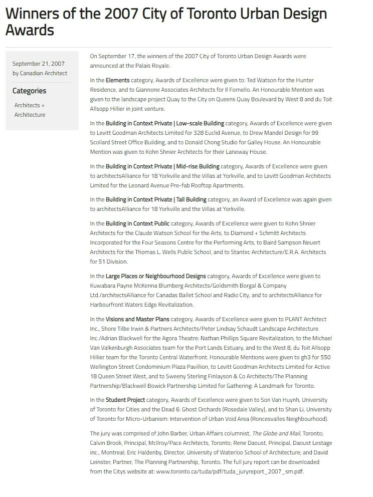 Galley Residence Wins 2007 City of Toronto Urban Design Award September 21, 2007 in News Return to NewsReturn to GalleyFor the full article please click on the link below